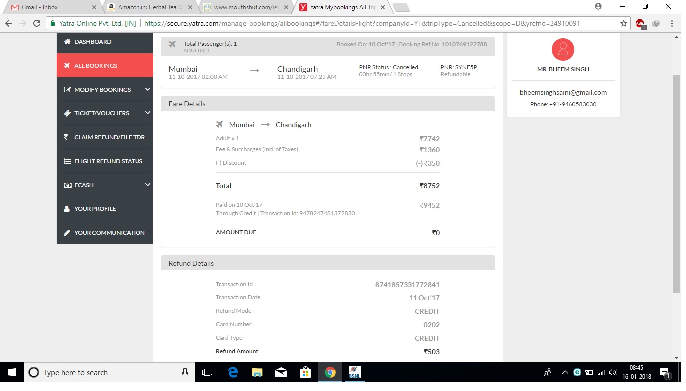 I booked an Airline ticket through yatra.com with Booking Ref No. 1010769122788 for Mumbai to Chandigarh . For this RS 9452 was spent by me. They send me the soft copy of the ticket that the ticket was confirmed . When I reached the airport with the ticket, the airline staff told me that their is no such ticket with these details.When I contracted with the yatra.com customer care for the incident, nobody from them is replying in proper manner. And when I asked for refund they refund me RS 503 out of RS 9452 . The ticket was not confirmed . Yatra.com eat thousands of my money . Accurate details of schedules of air-planes are not available on these web-sites.So friends never use these booking sites for booking tickets . They are big cheaters, fraudsters and money eaters.Don't waste your precious money like I waste.