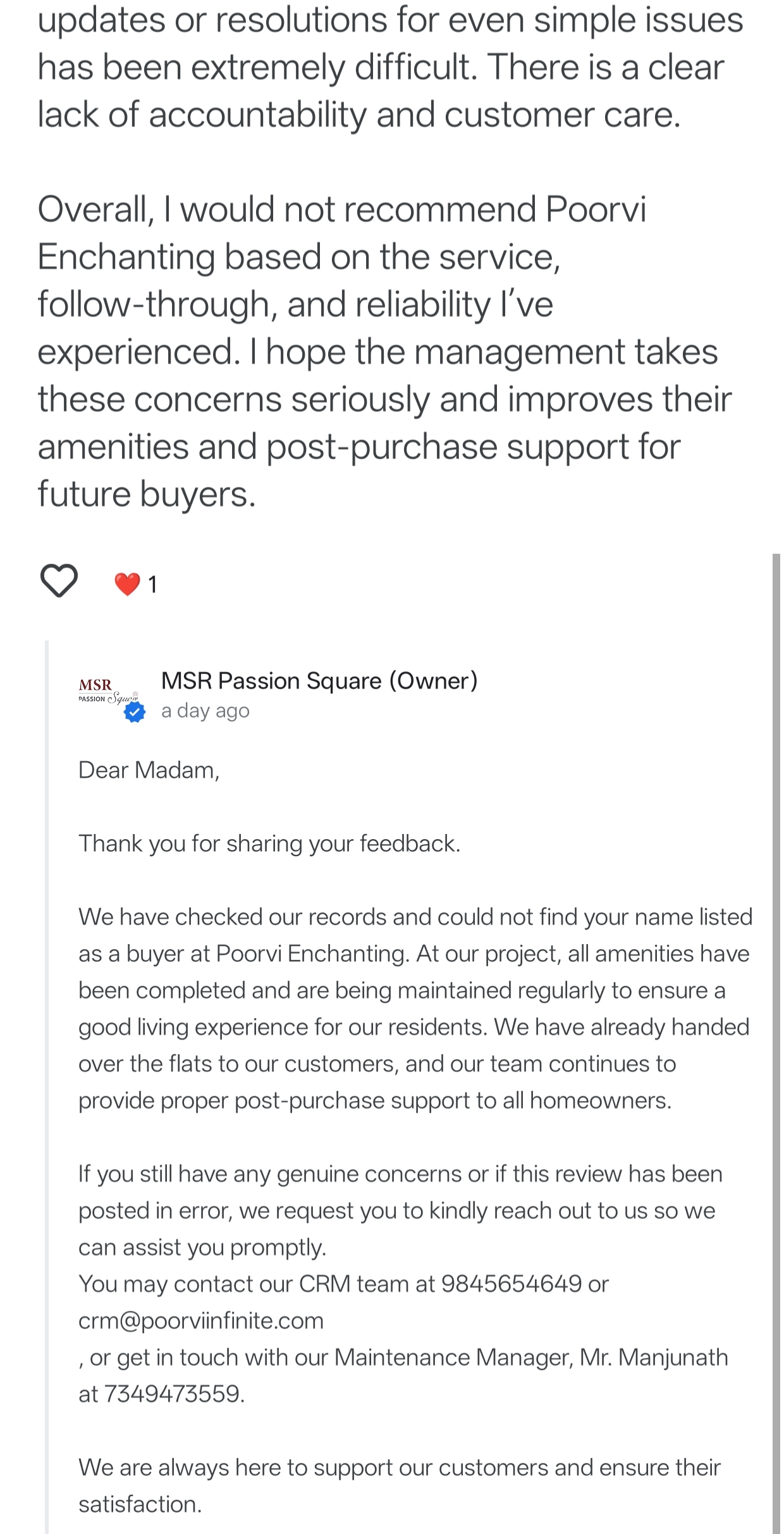 In summary, if you want a peaceful life for yourself and your family, avoid anything related to Poorvi Infinite, MSR Shelters, or whatever new name they adopt in the future. The builder acts fraudulently and changes names whenever negative publicity builds up.