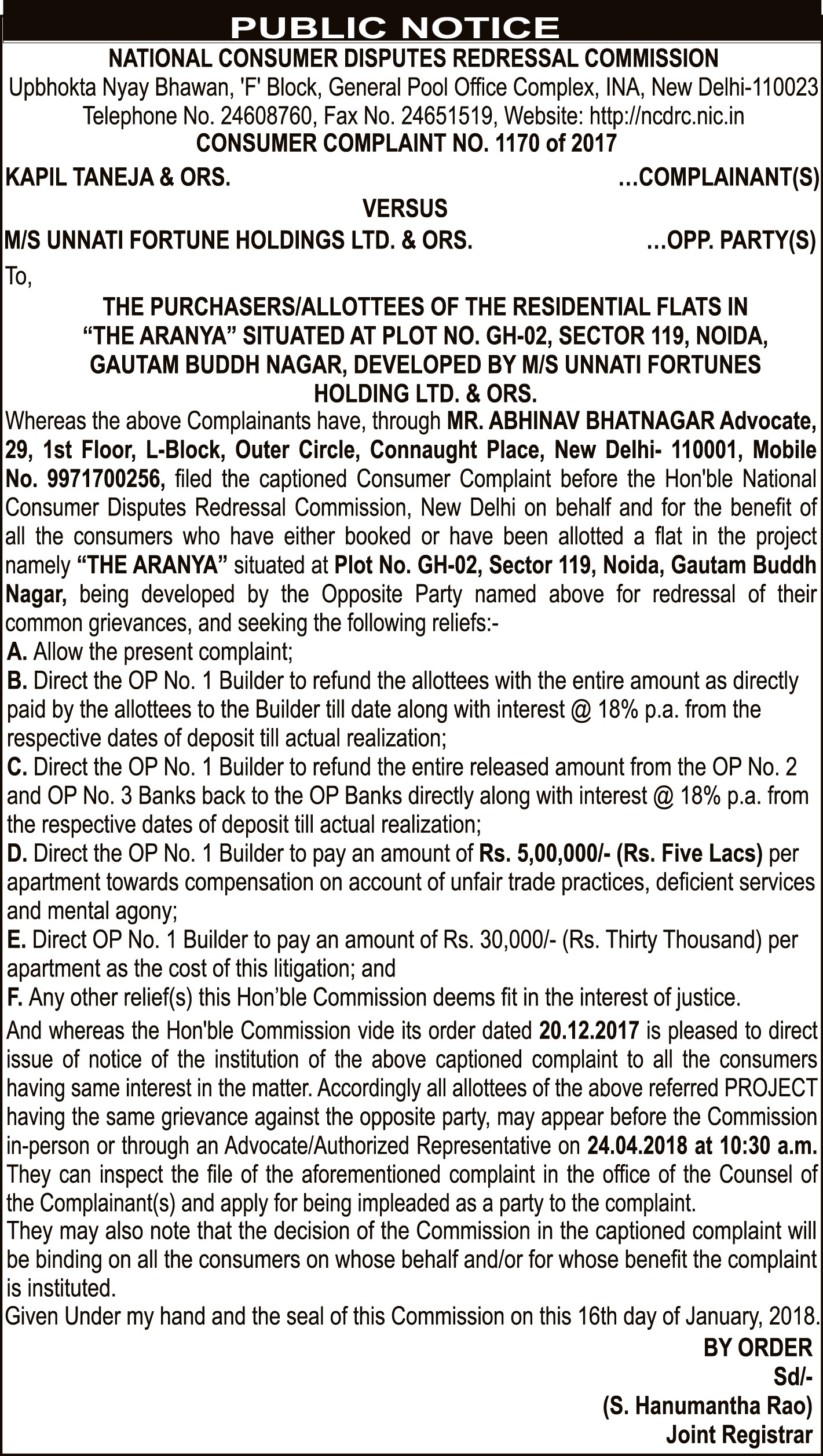 Hi, I booked a flat at Unnati Fortune's The Aranya Project in 2013 and was to receive the possession by 2017. However, the current state of the construction shows that the project cannot be completed for at least 2-3 years. The Builder has not only delayed the construction of the project but has also increased the super area and final price of the apartment without any information. All the buyers should collectively protest against the builder. There is a court complaint against the builder at the National Consumer Commission and I happened to read a notice of the court published in Times Of India on 25.01.2018. The Court is inviting all home buyers of the Aranya project by Unnati Fortune to come and join the case.Court notice has the name and no. of the lawyer who is fighting the case for buyers. Abhinav Bhatnagar Advocate Ph No. 9971700256 and has asked the buyers to join the case by April 2018. We buyers must unite and take strict action by participating in the case. Attaching the court notice for everyone to see.