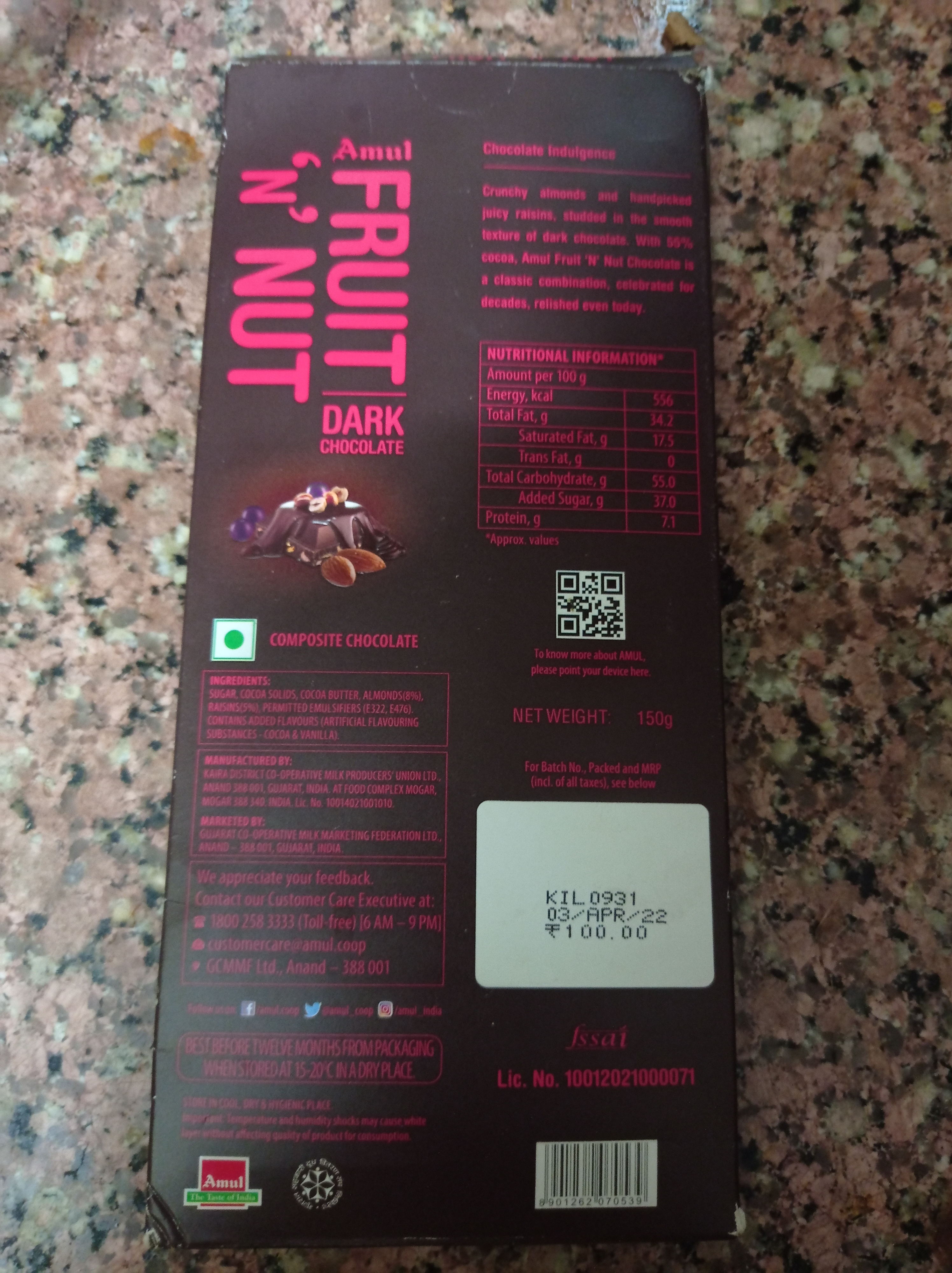 Home > Home and Appliances > Grocery Items > Chocolates > Amul Chocolates > Amul Fruit & Nut Chocolate > Good product