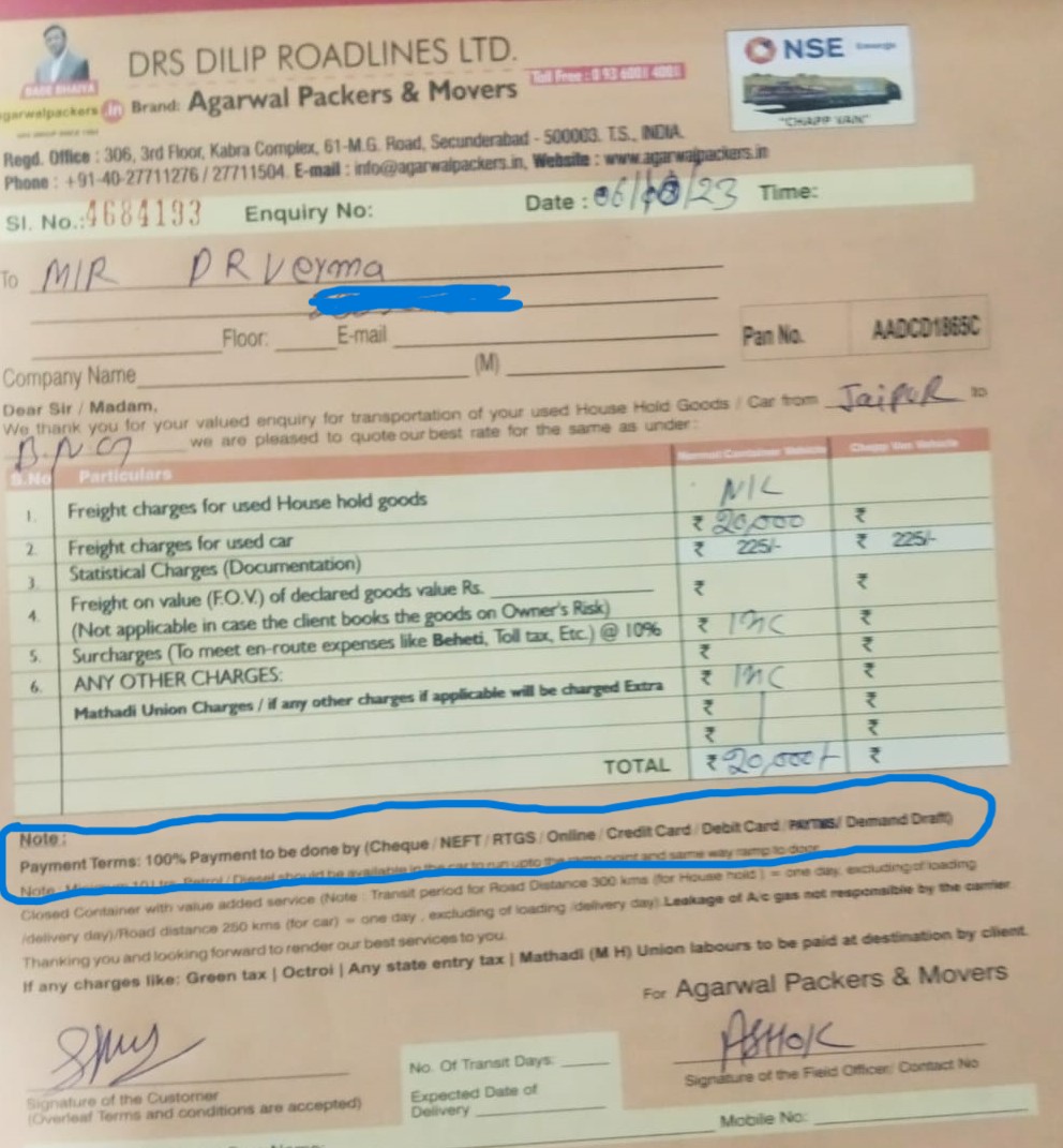 I am writing to address the disheartening experience I encountered during the recent shipment of my old car from Jaipur to Bangalore, initiated on the 6th of October 2023. This ordeal transpired due to a mix-up in my interactions with Mr. Ashok, whom I initially believed to be an employee of M/s Agarwal Packers and Movers but, as it later became apparent, was associated with DRS Road Lines-Jaipur. Our negotiations led to an agreement to transport my vehicle for a total cost of Rs. 20, 000. To my surprise, the quotation I received via WhatsApp displayed the branding of "DRS Dilip Road Lines Ltd, a Brand of Agarwal Packers and Movers." Despite this, I proceeded with delivering my vehicle to Mr. Ashok at the designated loading point in Jaipur, as we had previously discussed.
