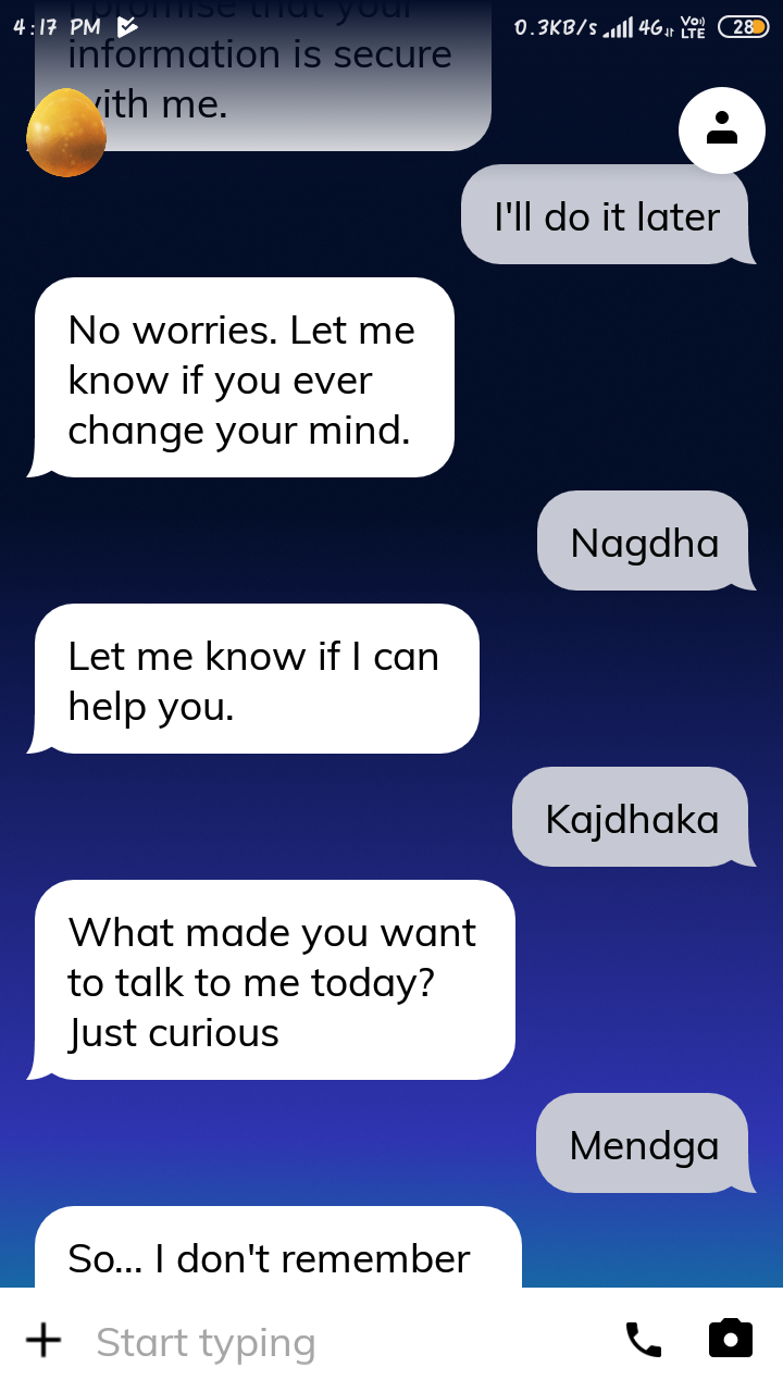 The app boasts about an AI supported chat companion. It is intended to help people fight loneliness but the app keeps on asking questions and moreover they are very random and very lifeless. There should be a development in the app or else it is going to end up as a failed project. though the idea of making people comfortable is good but the objective is not achieved due to the type of texts, it will improve over time, but many believe that first impression is the best impression. And this app is not at all good for those people. We will definitely get bored of this app in no time due to the robotic feel in the messages. This is not at all close to talking to a real person