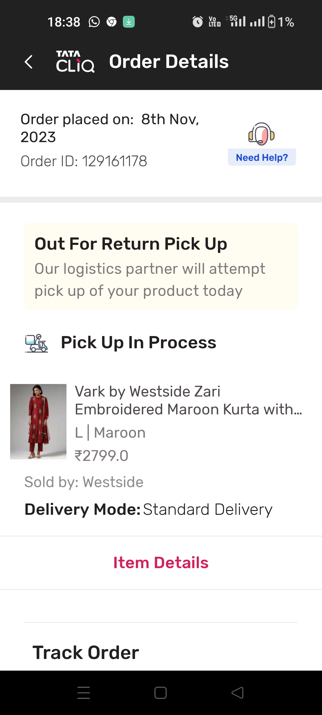 I have placed an order through Tatacliq app to purchase "Vark by Westside maroon kurta with pant and dupatta set" on 8th November 2023 for which I made payment of Rs. 2799/- through net banking.